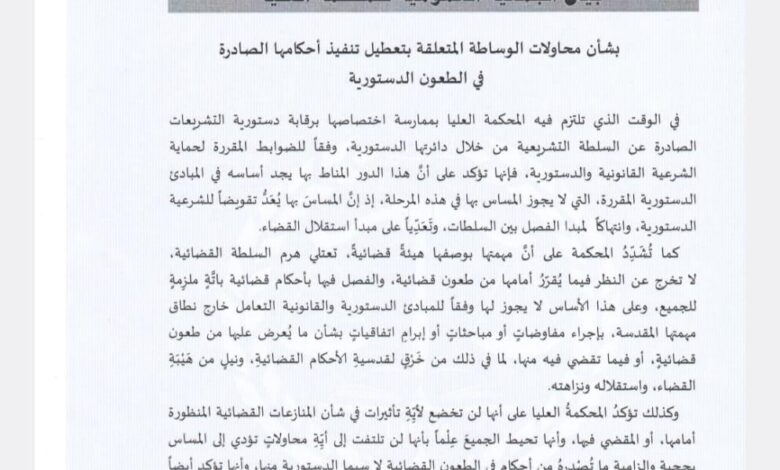 وفي بيان أصدرته الأربعاء (25 فبراير 2026م) بشأن محاولات الوساطة المتعلقة بتعطيل تنفيذ أحكامها الصادرة في الطعون الدستورية، أوضحت أنها لن تلتفت إلى أية محاولات تؤدي إلى المساس بحجة وإلزامية ما تصدره من أحكام في الطعون القضائية لا سيما الدستورية منها.