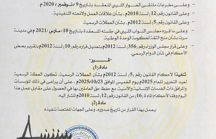 قرر رئيس مجلس الوزراء “عبدالحميد الدبيبة” أن تكون عطلة عيد التحرير للعام 2025 يوم الخميس (23 اكتوبر 2025م) تنفيذا لأحكام القانون رقم (5) لسنة 2012م بشأن العطلات الرسمية.