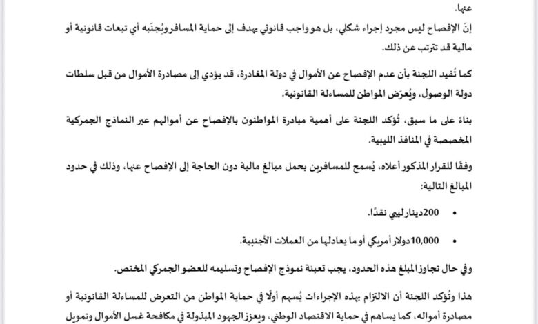 وأوضح البيان قيمة المبالغ التي بالإمكان حملها دون الحاجة إلى الإفصاح عنها، وهي في حدود (200) دينار ليبي، وفي حدود (10) آلاف دولار أمريكي أو ما يعادها من العملات الأجنبية، وفي حال تجاوز المبلغ هذه الحدود، فإنه يتوجب على المسافر تعبئة نموذج الإفصاح وتسليمه للعضو الجمركي المختص.
