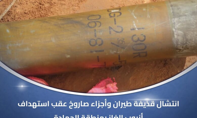 وذكرت على صفحتها الثلاثاء (24 مارس 2026م) أن فرقها انتشلت كذلك أجزاء من صاروخ منفجر عيار (130)، حيث تبيّن أنهما كانتا موضوعتين بالقرب من الصمام رقم (BT-13) على مسار خط أنبوب نقل النفط التابع لشركة الشرارة، والمتجه إلى مصفاة الزاوية. موضحة أنها تعاملت مع المقذوفات “وفق الإجراءات الفنية والأمنية المعتمدة، مع تأمين الموقع بشكل كامل واتخاذ التدابير اللازمة لضمان سلامة المنطقة ومنع أي مخاطر محتملة”