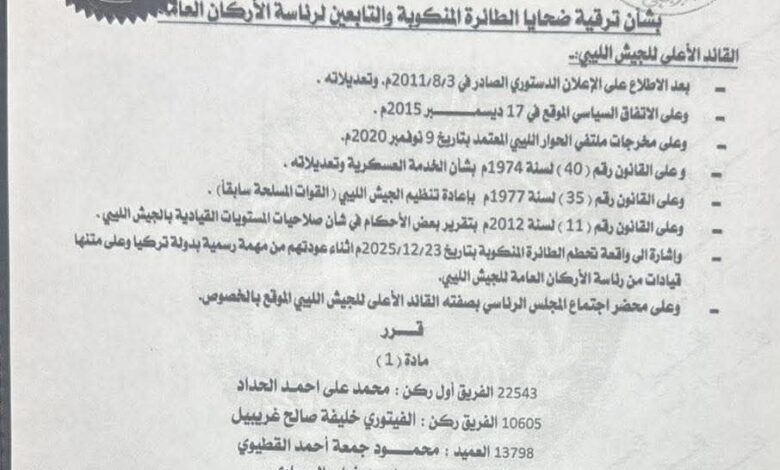 وأصدر السبت (17 ديسمبر 2025) القرار رقم (53) لسنة 2025م، والذي تضمن أيضا ترقية الفريق ركن الفيتوري غريبيل إلى فريق أول ركن، والعميد محمد الفطيوي إلى رتبة لواء، كما تضمن ترقية كلا من “محمد العصاوي” مستشار رئاسة الأركان، و”محمد محجوب” الإعلامي برئاسة الأركان، إلى الدرجة الوظيفية التي تلي درجاتهم الحالية.