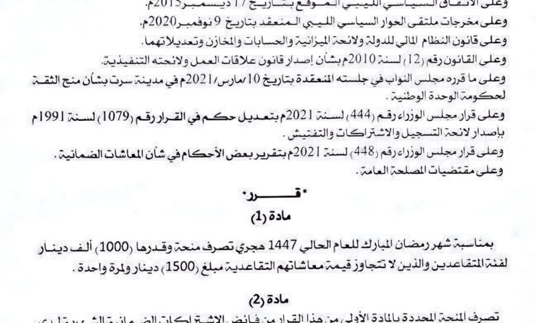 القرار الذي صدر الأحد (08 فبراير 2026م) نص في مادته الثانية على أن تصرف المنحة من فائض الاشتراكات الضمانية الشهرية لدى صندوق الضمان الاجتماعي، على أن تتولى وزارة الشؤون الاجتماعية متابعة تنفيذه.