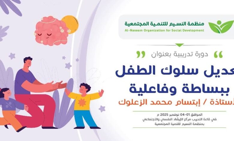 استضافت قاعة التدريب بمركز الإرشاد النفسي بمنظمة النسيم للتنمية المجتمعية دورة تدريبية بعنوان “تعديل سلوك الطفل ببساطة وفاعلية”، وذلك في الفترة من (01- 04 نوفمبر 2025م).