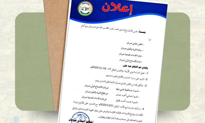 وقالت البلدية في بيان لها الثلاثاء (16 ديسمبر 2025م) إن قرار التعليق جاء بناءً على اجتماع موسّع عُقد بمقر المجلس ضم مراقبة التربية والتعليم وإدارة الخدمات الصحية وإدارة الإصحاح البيئي ، حيت نوقش خلاله الأوضاع الصحية الراهنة وسبل تعزيز الإجراءات الوقائية داخل المدارس، بما يضمن توفير بيئة تعليمية آمنة تتماشى مع المعايير الصحية المعتمدة.