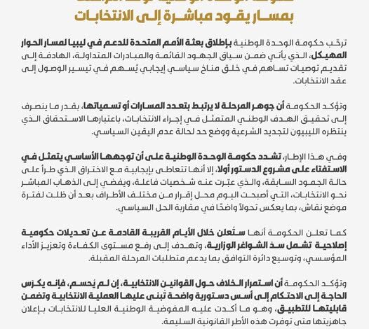 ولفتت الحكومة أن جوهر المرحلة لا يرتبط بتعدد المسارات أو تسمياتها، بقدر ما ينصرف إلى تحقيق الهدف الوطني المتمثل في إجراء الانتخابات، باعتبارها الاستحقاق الذي ينتظره الليبيون لتجديد الشرعية ووضع حد لحالة عدم اليقين السياسي.