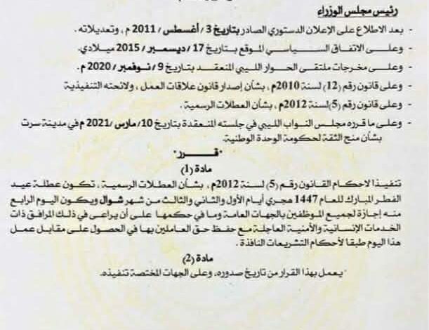 قرر رئيس مجلس الوزراء أن تكون عطلة عيدالفطر المبارك للعام الجاري هي أيام الأول والثاني والثالث من شوال، وأن يكون اليوم الرابع من شوال إجازة لجميع الموظفين بالجهات العامة وما في حكمها.