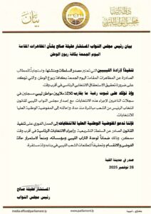 وذكر البيان أنه يستجيب لمظاهرات أقيمت الجمعة “بكافة ربوع الوطن” أكدت على ضرورة تحقيق الاستحقاق الانتخابي الرئاسي. مشيرا إلى قانون الانتخابات الذي أصدره مجلس النواب وأحاله للمفوضية الوطنية العليا للانتخابات.