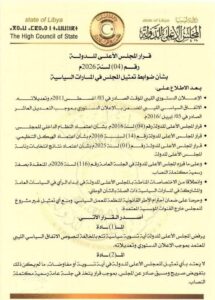 وترجمة لهذا التوجه خرجت الجلسة بالقرار رقم (04) لسنة 2026م، بشأن ضوابط تمثيل مجلس الدولة في المسارات السياسية، والذي جاء في مادته الأولى “يرفض المجلس الأعلى للدولة أي تسوية سياسية تتم بالمخالفة لنصوص الاتفاق السياسي الليبي المعتمد بموجب الإعلان الدستوري وتعديلاته”، وفي المادة الثانية “لا يعتد بأي تمثيل للمجلس الأعلى للدولة في أية تسوية أو مفاوضات، مالم يكن ذلك بتفويض صريح ومسبق صادر عن المجلس، بموجب قرار يتخذ في جلسة عامة رسمية مكتملة النصاب”.