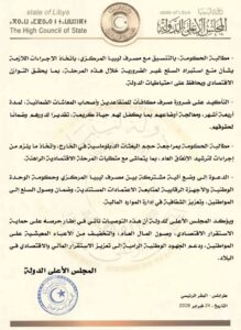 أوصى المجلس الأعلى للدولة بوقف الصرف على باب التنمية إلى حين الالتزام باتفاق الصرف الموحد الذي تم بين مجلسي النواب والدولة في نوفمبر الماضي بحضور محافظ المصرف المركزي.