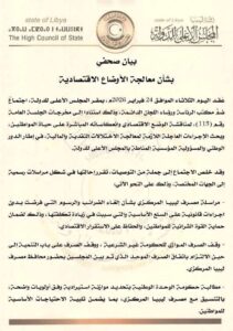 أوصى المجلس الأعلى للدولة بوقف الصرف على باب التنمية إلى حين الالتزام باتفاق الصرف الموحد الذي تم بين مجلسي النواب والدولة في نوفمبر الماضي بحضور محافظ المصرف المركزي.
