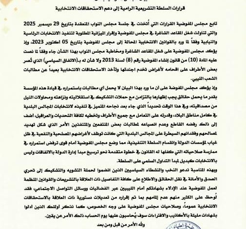 جاء ذلك في بيان لمجلس المفوضية على خلفية القرارات التي اتخذها مجلس النواب في جلسته الأثنين (29 ديسمبر 2025م) والتي تناولت شغل المقاعد الشاغرة في مجلس المفوضية وإقرار الميزانية المطلوبة لتنفيذ الانتخابات الرئاسية والنيابية وفقاً لما ورد بالقوانين الانتخابية المحالة إلى مجلس المفوضية بتاريخ 05 أكتوبر 2023 .