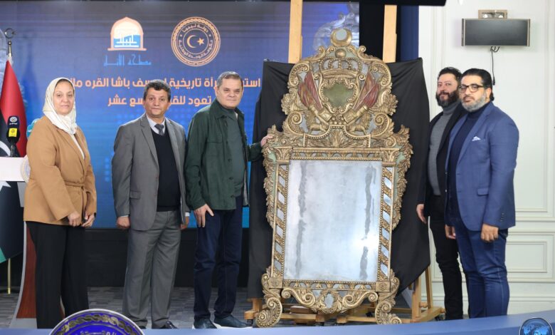 تسلمت مصلحة الآثار الليبية الخميس (04 ديسمبر 2025م) مرآة تاريخية نادرة تعود إلى عهد يوسف باشا القرمانلي (1795–1832)، بحضور رئيس حكومة الوحدة الوطنية عبدالحميد الدبيبة ،وذلك بعد استردادها بجهود فريق عمل المسلسل التاريخي “السرايا” الذي وثق مرحلة الحكم القرمانلي الممتدة من عام 1711 حتى 1835.