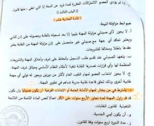 ومن الوثائق التي أمدنا بها الضيف هي النظام الأساسي للنقابة العامة للصيادلة الذي جاء في المادة (11) منه الفقرة د ما نصه: “يشترط فيمن يختار لمهام الأمانة العامة أو الأمانات الفرعية أن يكون صيدليا، وأن يكون قد زاول المهنة لمدة تجاوز الأربع سنوات على الأقل“.