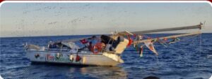 تابع الفريق إبحار السفينة ساعة بساعة، إلى أن وصلهم في التاسع عشر من سبتمبر أن السفينة (الشراعية) تواجه عاصفة قوية، وبعد ثلاث ساعات كان الصاري قد تحطم، وأصيبت السفينة إصابة كبيرة جدا، وبفضل الله لم تكن هناك إصابات بين المشاركين.