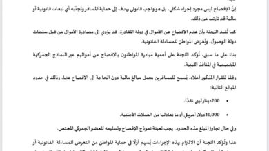 الوطنية لمكافحة غسيل الأموال محذرة المسافرين: عدم الإفصاح عن الأموال المصحوبة عند السفر قد يؤدي إلى مصادرتها من قبل سلطات دولة الوصول